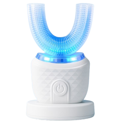 Ultrasonic 360º toothbrush with LED blue light and medical-grade U-shape silicone for automatic deep cleaning. Rechargeable, waterproof, travel-ready.